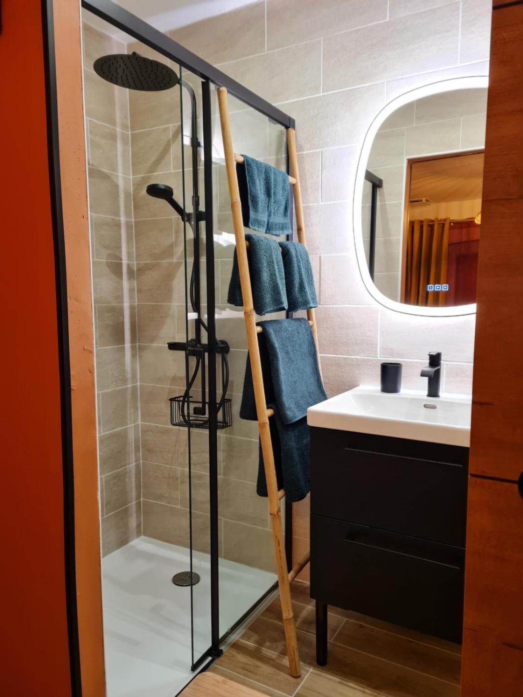 Chambre Double avec Salle de Bains Privative. Dotée dune terrasse donnant sur le jardin, cette chambre double possède la climatisation, une entrée indépendante ainsi qu’une salle de bains privative avec une douche. Le logement compte 1 lit.