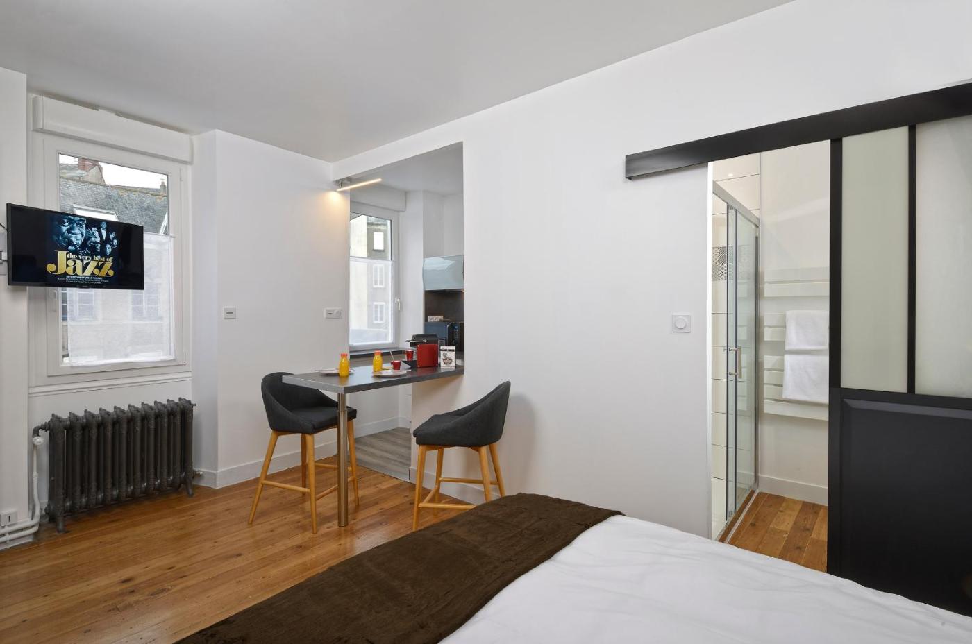 Appartement avec Douche. This apartment includes a kitchen, a seating area, 1 separate bedroom and 1 bathroom with a shower and a hairdryer. Meals can be prepared in the well-fitted kitchen, which is fitted with a refrigerator, kitchenware, a microwave and a toaster. The apartment offers a TV, a coffee machine, parquet floors and heating. The unit has 1 bed. ;