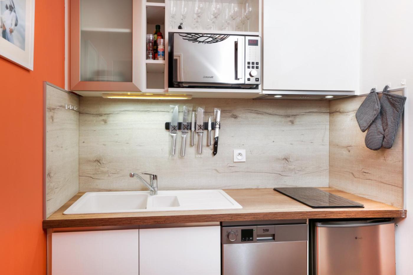 Appartement 1 Chambre. Boasting a private entrance, this apartment also includes 1 living room, 1 separate bedroom and 1 bathroom with a shower. Guests can make meals in the kitchen that is fitted with a stovetop, a refrigerator, a dishwasher and kitchenware. This apartment has a tea and coffee maker, TV with cable channels, city views, as well as winechampagne for guests. The unit has 2 beds.