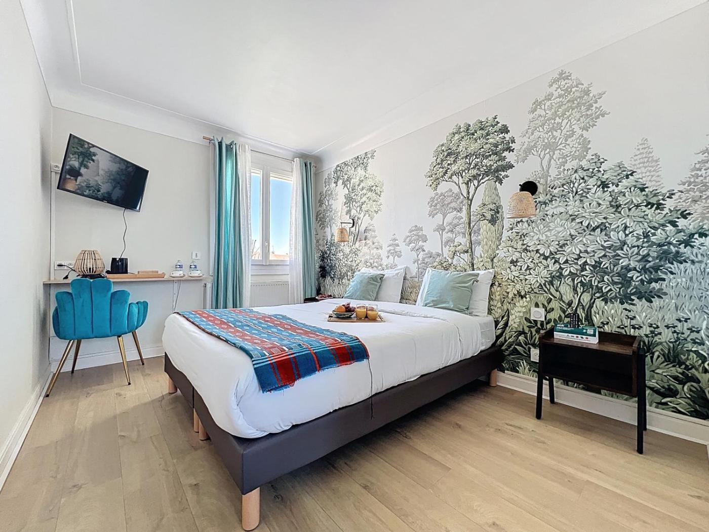 Chambre Triple - Vue sur Jardin. The triple room provides air conditioning, a tea and coffee maker, as well as a private bathroom featuring a shower and a hairdryer. This triple room features a wardrobe, parquet floors, flat-screen TV, as well as winechampagne for guests. ;
