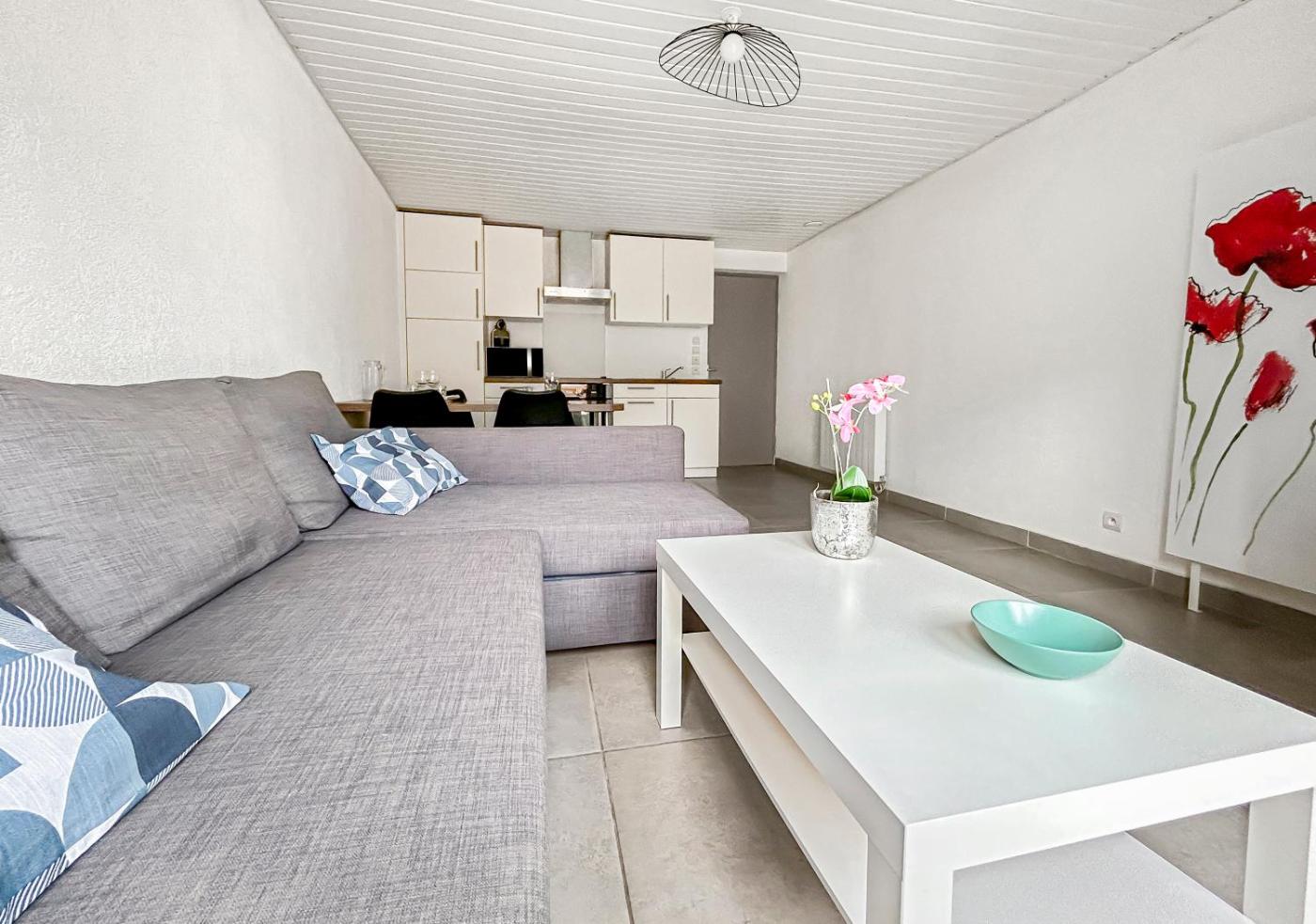 Appartement 1 Chambre. Boasting a private entrance, this apartment features 1 living room, 1 separate bedroom and 1 bathroom with a shower and a hairdryer. Guests can make meals in the kitchen that has a stovetop, a refrigerator, kitchenware and an oven. The apartment features a washing machine, a tea and coffee maker, a seating area along with a terrace. The unit has 2 beds.