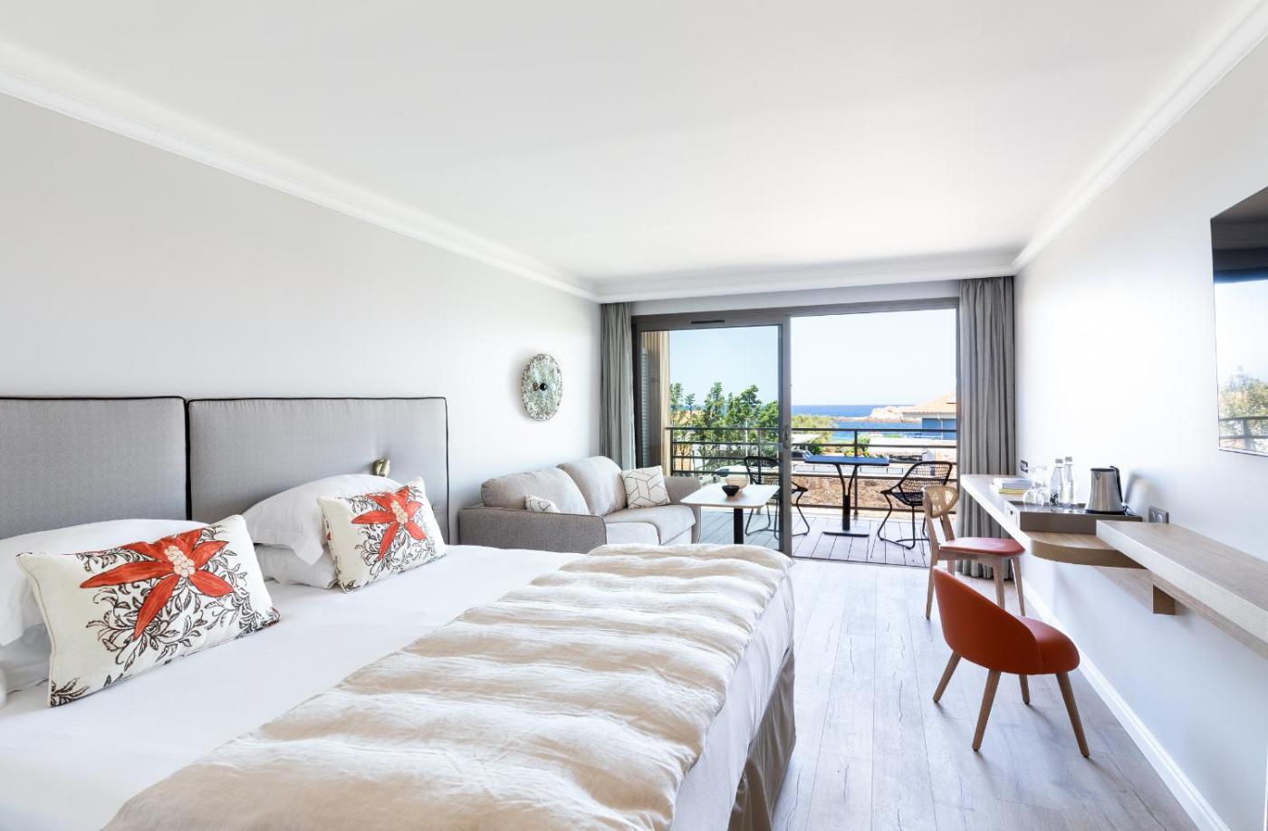 Suite avec Jacuzzi. Cette suite possède une baignoire spa. Cette suite comprend une chambre, une kitchenette, une terrasse et une salle de bains avec une douche. La kitchenette est équipée de plaques de cuisson, d’un réfrigérateur, d’un lave-vaisselle et d’ustensiles de cuisine. Cette suite dispose d’un balcon avec vue sur la mer, de murs insonorisés et d’une télévision à écran plat. Ce logement comprend 2 lits. ;