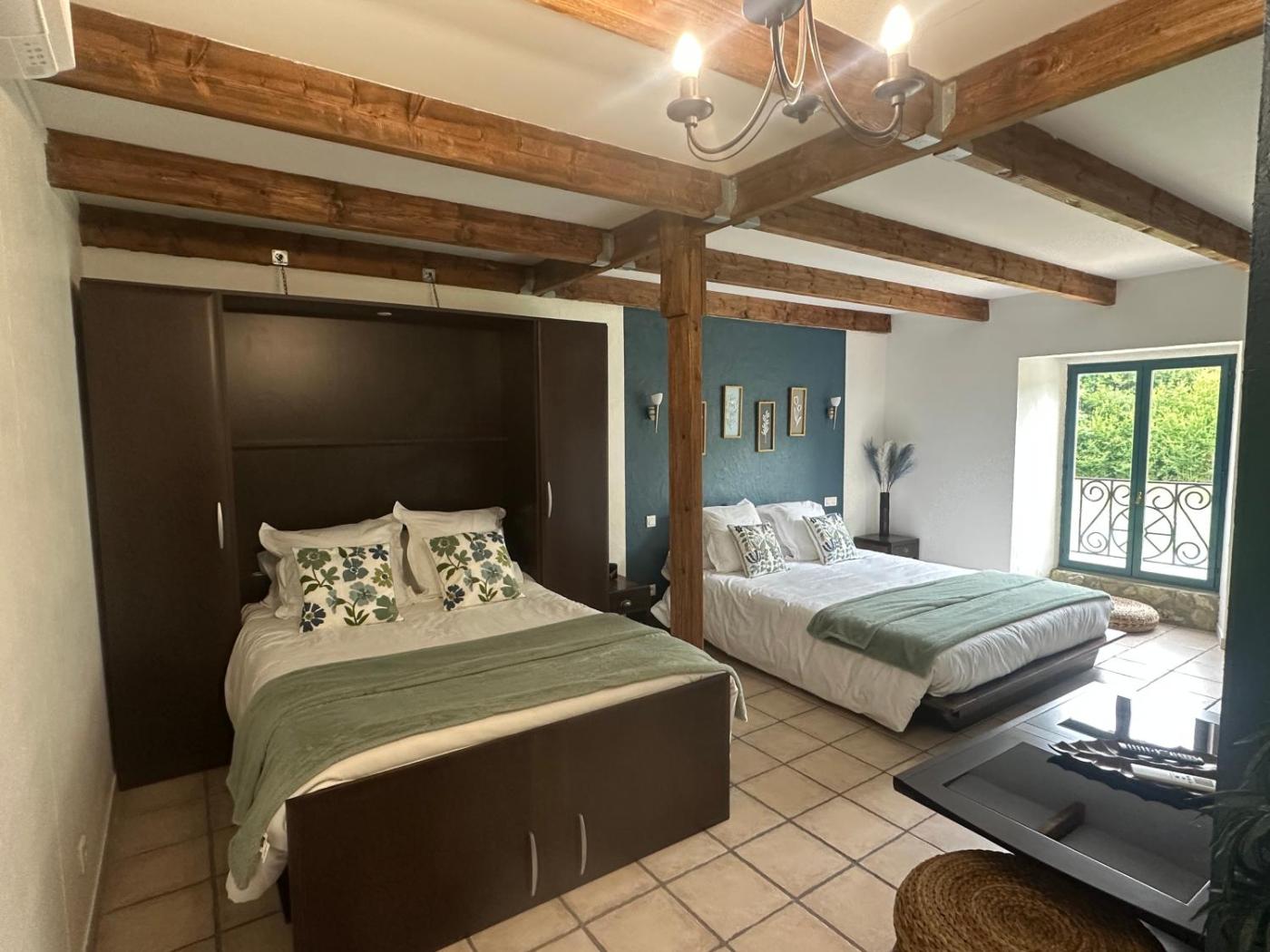 Chambre Quadruple. The quadruple room offers a tiled floor and heating, as well as a private bathroom boasting a walk-in shower. The air-conditioned quadruple room features a flat-screen TV, a tea and coffee maker, a seating area, a wardrobe as well as garden views.