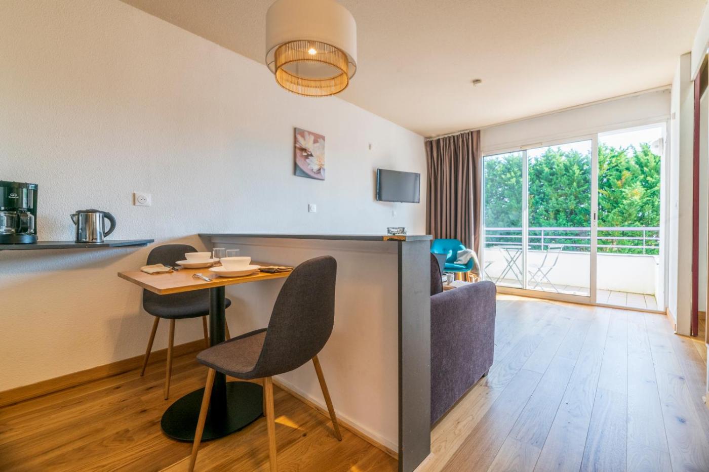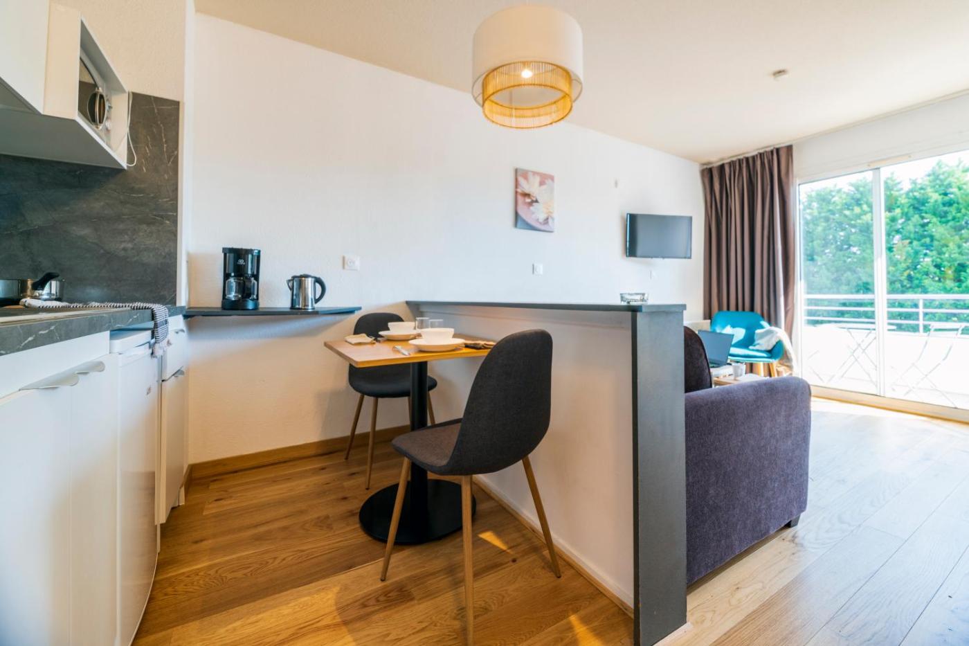 Tous les appartements de la résidence Les Jardins du Lac comprennent un coin repas et salon avec une télévision à écran plat ainsi qu’une kitchenette entièrement équipée. Ces appartements modernes présentent également un balcon meublé et un dressing.